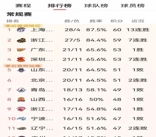 隨著本輪四場激戰(zhàn)塵埃落定,最新積分榜呈現(xiàn)前所未有的戲劇性變化。上海隊以28勝4負傲視群雄,憑借十三連勝穩(wěn)坐頭把交椅。