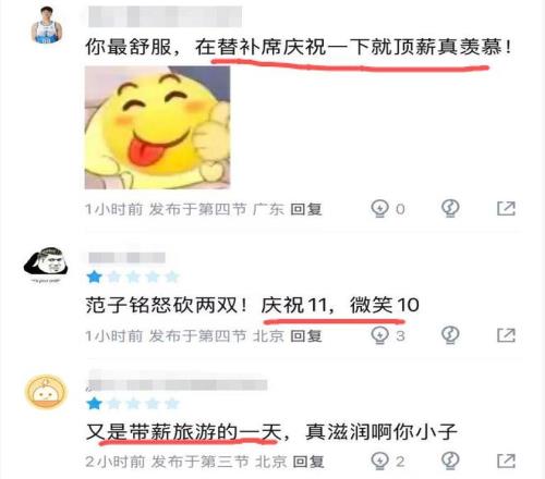 范子銘本場繼續(xù)被DNP,也引來了球迷的調(diào)侃:“趙睿C類合同場場30多分鐘,我范大將軍頂薪場場休息,就問你們羨不羨慕”、“范子銘怒砍兩雙!慶祝11,微笑10”、“你最舒服,在替補(bǔ)席慶祝一下就頂薪真羨慕!”