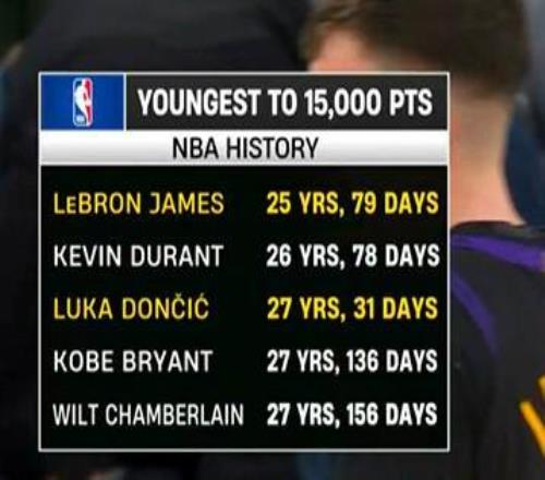 據(jù)統(tǒng)計(jì),27歲31天的東契奇成為歷史第三年輕的15000分先生,僅次于詹姆斯(25歲79天)和杜蘭特(26歲78天)。