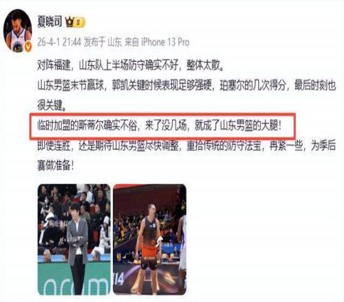 山東隊媒體人夏曉司直言:“斯蒂爾正成為球隊真正的大腿。”他不僅是得分核心,更是戰(zhàn)術支點——在克里斯缺陣期間,他撐起了山東隊的內線攻防體系,助球隊豪取兩連勝。