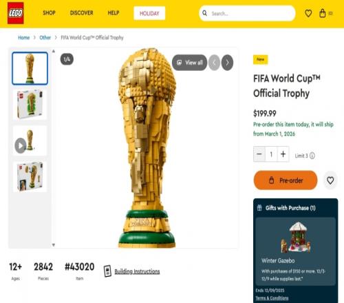 而根據(jù)此前的消息,國際足聯(lián)與樂高集團(tuán)合作推出1:1復(fù)刻的大力神杯,售價199美元。