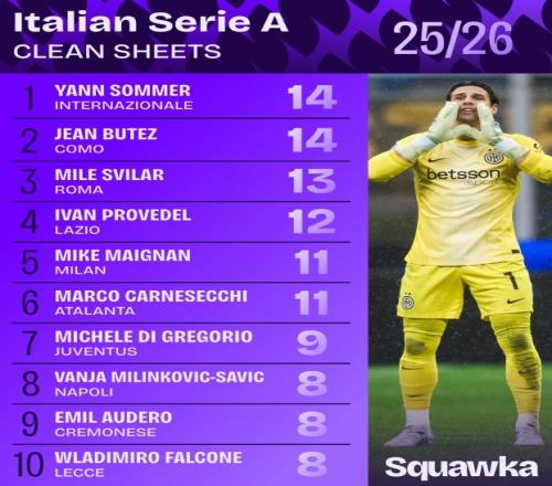 本賽季意甲零封榜:索默14次第一,邁尼昂第5、迪格雷戈里奧第7
