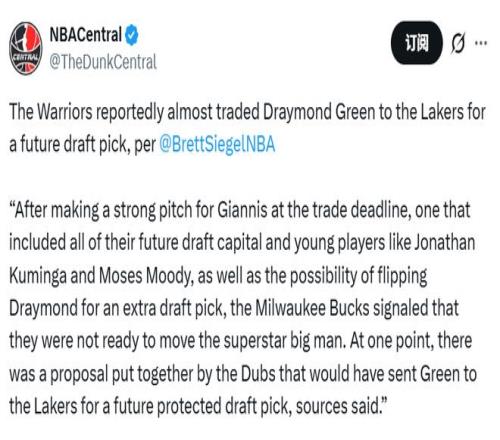 名記西格爾透露,勇士當時在全力梭哈追求字母哥,不僅愿意送出年輕籌碼和未來選秀權,還一度向湖人提出用格林換取一個未來受保護選秀權的報價。