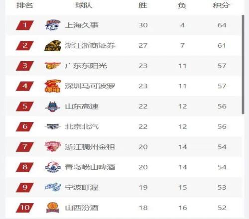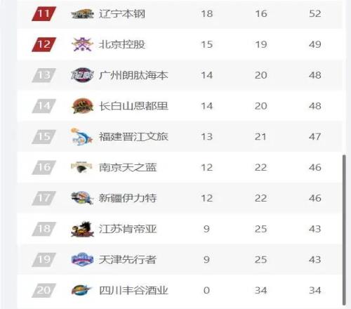 CBA最新排名,廣東第3,深圳第4,遼寧跌至第11位