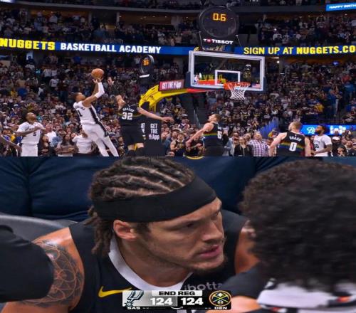 ——剩下6.5秒前,約基奇低位接球,吸引了尚帕尼和文班亞馬兩人防守,然后迅速傳球空切籃下的戈登,接球后的戈登用一記扣籃幫助掘金追平比分