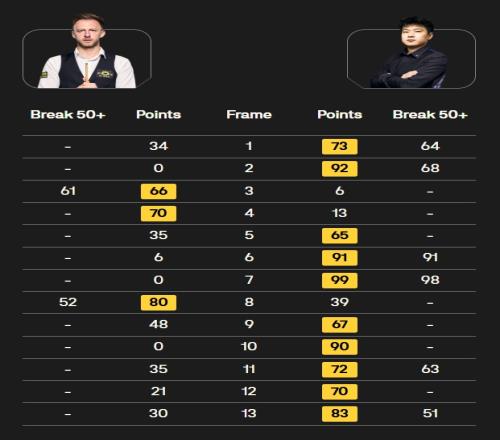 整場(chǎng)對(duì)決中,趙心童狀態(tài)火熱,接連轟出五桿50+(64、68、91、98、63);特魯姆普打出兩桿50+(61、52)。
