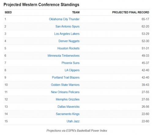 ESPN預(yù)測西部最終排名:雷霆力壓馬刺湖人仍居第三&首輪打森林狼