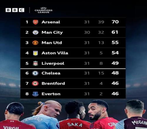 與此同時,因為下賽季歐冠有5個參賽名額,也意味著阿森納提前7輪獲得參賽資格。目前英超聯(lián)賽已經(jīng)進行到第31輪,阿森納積70分,已經(jīng)領(lǐng)先第6名的切爾西22分。