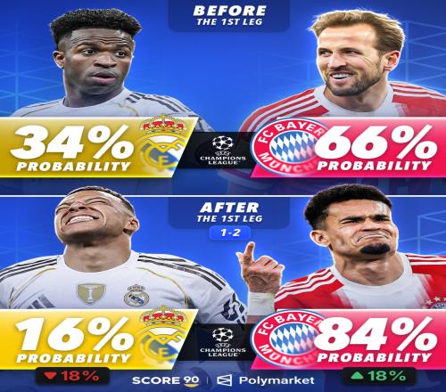 本場賽前,皇馬晉級歐冠四強的概率為34%,拜仁為66%;首回合比賽結(jié)束后,皇馬的晉級概率被下調(diào)至16%,拜仁則上升至84%。