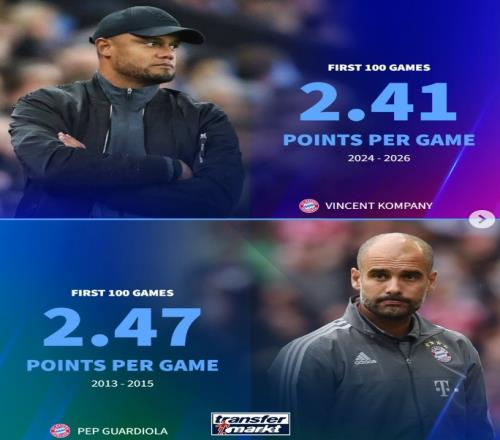 德轉(zhuǎn)對比拜仁多位名帥百場場均積分:孔帕尼2.41分僅次于瓜迪奧拉