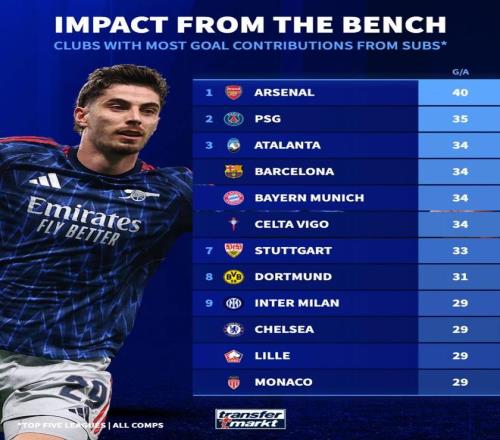 北京時間4月8日,德轉(zhuǎn)統(tǒng)計出了本賽季至今歐洲五大聯(lián)賽球隊替補球員在各項賽事中直接參與進球數(shù)的排行榜,阿森納以40球排名第一,巴黎圣日耳曼35球第二,巴塞羅那和拜仁慕尼黑34球并列第三。
