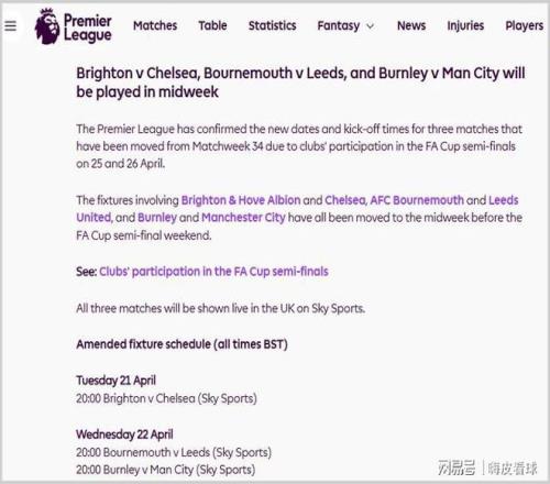 具體而言,足總杯半決賽安排在4月25日的周末舉行,切爾西客場挑戰(zhàn)布萊頓的聯(lián)賽,改在4月21日進(jìn)行,曼城客場挑戰(zhàn)伯恩利,以及利茲聯(lián)客場挑戰(zhàn)伯恩茅斯,都改在4月22日進(jìn)行。