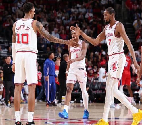 北京時(shí)間4月10日,NBA常規(guī)賽繼續(xù)進(jìn)行,費(fèi)城76人隊(duì)前往客場(chǎng)挑戰(zhàn)休斯頓火箭隊(duì)?;鸺?duì)正處于7連勝中,這是聯(lián)盟現(xiàn)存第2長(zhǎng)連勝紀(jì)錄,僅次于掘金隊(duì)的10連勝。烏度卡主動(dòng)變陣將奧科吉提到首發(fā)陣容,火箭首發(fā)五虎為杜蘭特+申京+阿門+史密斯+奧科吉。76人隊(duì)正處于2連敗中,大帝因接受闌尾炎手術(shù)無(wú)法出戰(zhàn),76人隊(duì)首發(fā)五虎為馬克西+喬治+埃奇庫(kù)姆+烏布雷+博納。