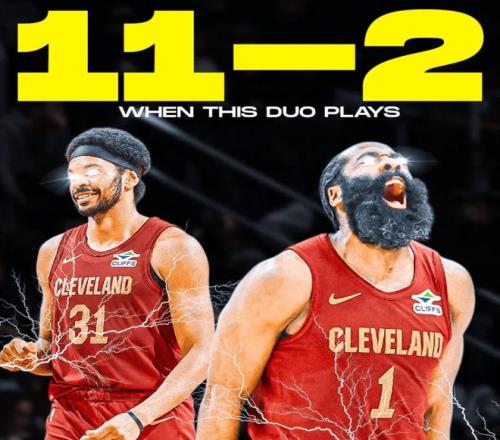 4月10日,美國媒體ClutchPoints曬出一份數(shù)據(jù):當(dāng)哈登和阿倫同時登場時,騎士11勝2負(fù)!