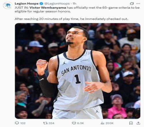 美媒LH表示,文班亞馬這場(chǎng)比賽復(fù)出就是為了達(dá)成65場(chǎng)的評(píng)獎(jiǎng)資格,他打個(gè)20多分鐘就直接打卡了。馬刺隊(duì)史至少砍下5次40+的球員只有羅賓遜與文班亞馬。