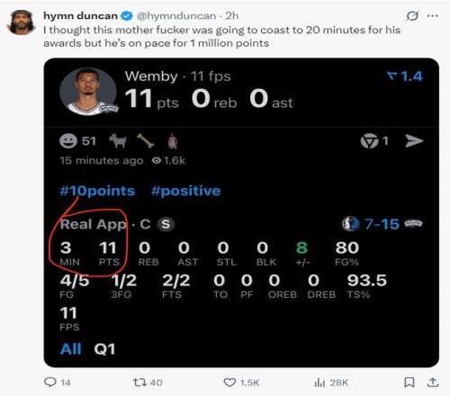 文班亞馬在短短20分鐘里,19中11,拿到30分10籃板3助攻1搶斷1蓋帽,完全看不出文班亞馬有傷病的困擾。