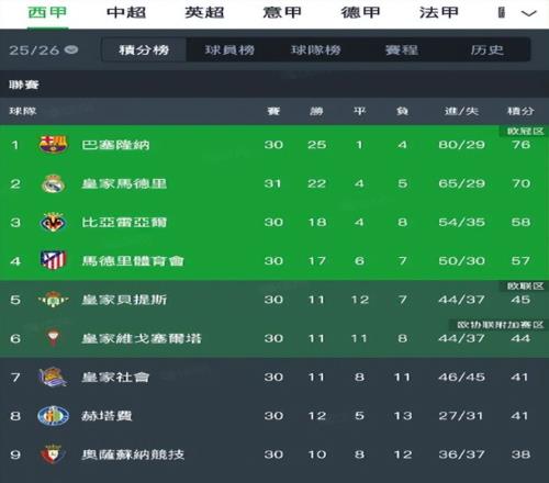 西甲官網(wǎng)最新積分榜顯示:皇馬在少賽一輪的情況下積70分,而領(lǐng)頭羊巴薩已斬獲76分,雙方分差擴(kuò)大至6分。更嚴(yán)峻的是,巴薩本輪尚未開賽——倘若紅藍(lán)軍團(tuán)順利贏球,分差將飆升至9分,屆時(shí)皇馬理論上的爭(zhēng)冠概率將趨近于零。