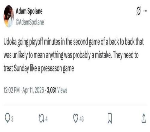 賽后火箭隊(duì)記Adam Spolane公開(kāi)怒批烏度卡,在背靠背第二場(chǎng),勝負(fù)大概率無(wú)關(guān)緊要的情況下,還是讓主力打了季后賽級(jí)別的登場(chǎng)時(shí)間。