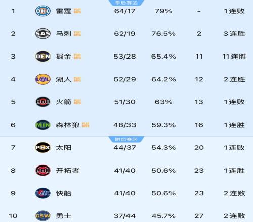 隨著湖人大勝太陽,掘金贏雷霆,火箭輸球,西部前10排名基本確定