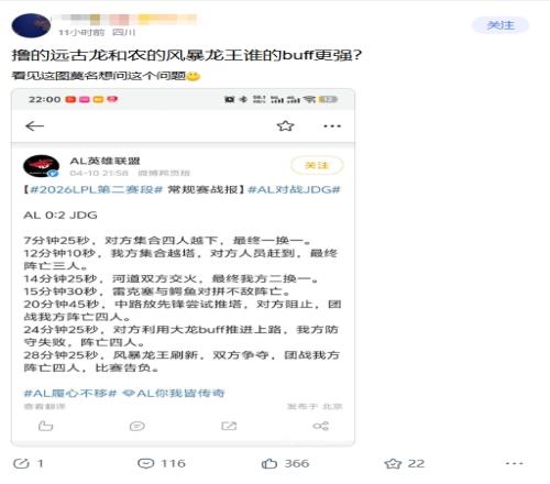 體育播報(bào)4月11日宣 在昨日的LPL第二賽段比賽上,AL以0-2的比分不敵JDG,賽后AL官方在微博的戰(zhàn)報(bào)中誤將遠(yuǎn)古巨龍寫成了王者榮耀中的風(fēng)暴龍王,隨后有貼吧網(wǎng)友發(fā)帖“遠(yuǎn)古龍和風(fēng)暴龍王誰的buff更強(qiáng)”引發(fā)爭議。