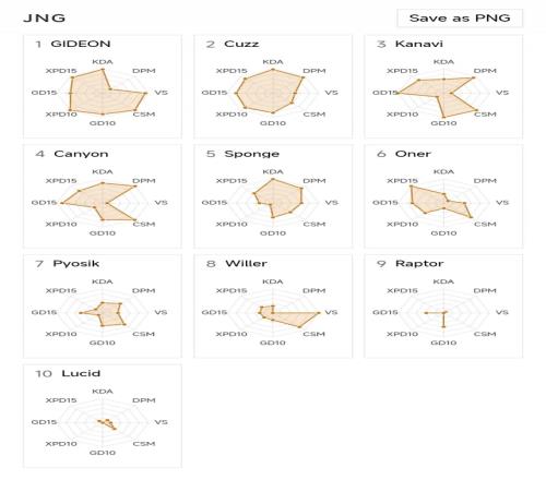 還有時鐘型選手LCK打野位數(shù)據(jù)雷達:BRO打野GIDEON數(shù)據(jù)最佳