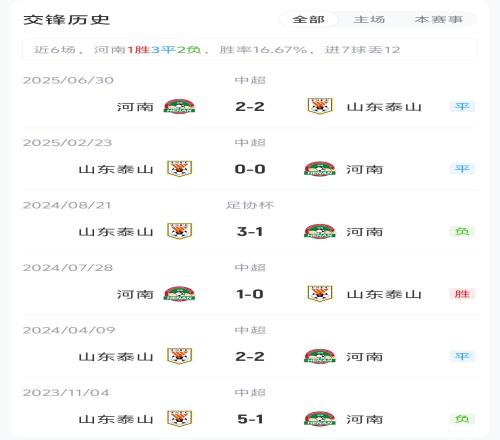 前4輪河南2勝1平1負(fù),積1分(河南被罰6分開(kāi)局)暫居第十;泰山2勝2負(fù),積0分(泰山被罰6分開(kāi)局)暫居第十一。上賽季兩回合交手,雙方均握手言和。