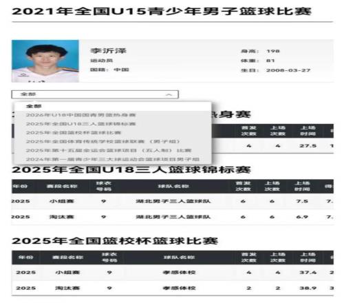 根據(jù)官方注冊信息,李沂澤登記出生日期為2008年3月27日,現(xiàn)為湖北青年男籃及U18國青隊(duì)核心球員,2024年代表湖北出戰(zhàn)全國青少年三大球運(yùn)動(dòng)會(huì)。 而此前在2019年全國U15男子預(yù)賽中,一名名為張涵泊的球員(注冊出生日期為2006年3月19日)代表焦作業(yè)余籃校參賽,其外貌、左手投籃習(xí)慣、頸部痣位等特征與李沂澤高度相似。