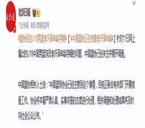 北京時(shí)間4月12日消息,中國籃球協(xié)會(huì)已就U18國青球員李沂澤年齡爭議正式回應(yīng),目前正聯(lián)合相關(guān)部門開展核查工作,承諾將本著嚴(yán)肅、實(shí)事求是的原則處理,并及時(shí)公布結(jié)果。