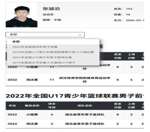 值得注意的是,張涵泊在2021-2022年仍以武漢體育學(xué)院附屬體校球員身份參加U17賽事,此后再無公開比賽記錄。而“武漢籃校(武體籃校)”與“武漢體育學(xué)院附屬體?!睂?shí)為同一機(jī)構(gòu),隸屬武漢體育學(xué)院,兩球員所屬單位高度重合。