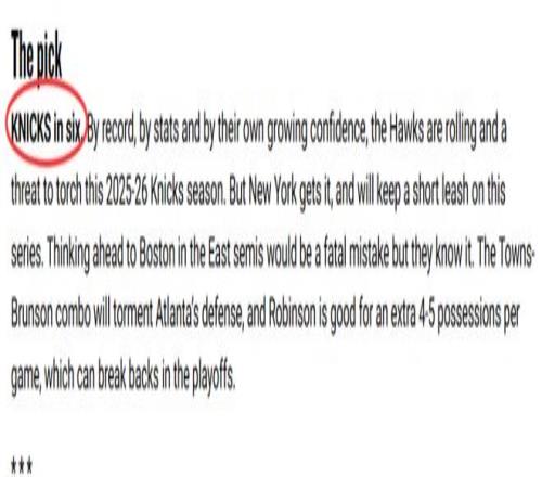 但尼克斯經(jīng)驗(yàn)更足,會(huì)在系列賽中牢牢把控局勢(shì)。提前想著東部半決賽對(duì)陣凱爾特人會(huì)是致命錯(cuò)誤,而他們很清楚這一點(diǎn)。