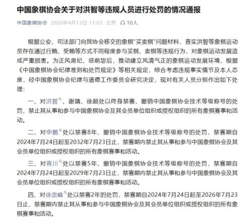 一、對洪智、謝靖、徐超處以終身禁賽、撤銷中國象棋協(xié)會技術(shù)等級稱號的處罰,禁止其從事和參與中國象棋協(xié)會及其會員單位組織或授權(quán)組織的所有象棋賽事和活動。