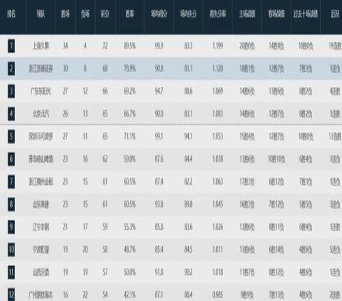 廣東隊目前取得27勝12負戰(zhàn)績排名聯盟第三,僅次于上海隊(34-4)和衛(wèi)冕冠軍廣廈隊(30-8),北京隊26勝13負位列第四,超級黑馬深圳隊27勝11負第五。