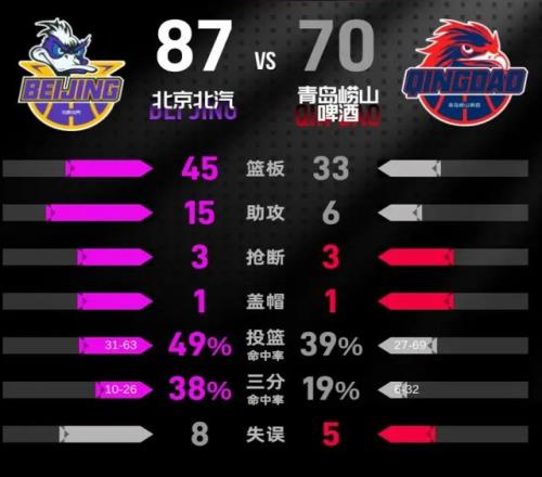 此役,兩支球隊的主要球員數(shù)據(jù)為:北京隊:杰曼29分2板4助、麥基22分4板2斷、周琦12分10板1助、貝利9分1板1助、雷蒙6分3板2助、陳盈駿6分2助、斯佩爾曼2分6板。青島隊:楊24分2板1助、韋瑟斯龐19分3板3助、米奇11分9板、王睿澤6分1板、呂俊虎3分6板、林韋愷2分2板、克勞福德2分2板。