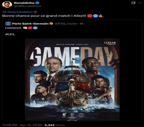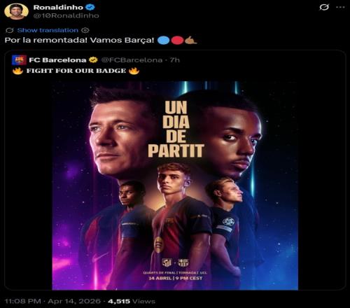 羅納爾迪尼奧在個人社媒轉(zhuǎn)發(fā)了巴薩、巴黎兩隊(duì)次回合的海報,為老東家送上祝福。