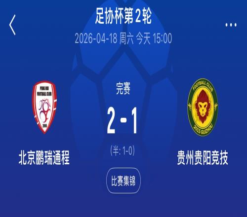 體育播報(bào)04月18日宣 根據(jù)《北京日?qǐng)?bào)》報(bào)道,2026中國(guó)足協(xié)杯第2輪,北京通州鵬瑞2比1戰(zhàn)勝貴州貴陽(yáng)競(jìng)技。