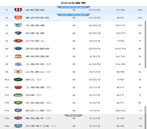 中超6輪積分榜:3隊(duì)不敗,西南三強(qiáng)格局被打破,申花前8,3隊(duì)負(fù)分