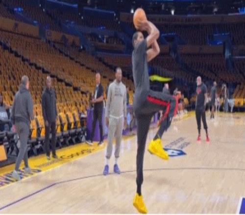 賽前,杜蘭特進(jìn)行熱身,看來(lái)膝蓋傷勢(shì)并不嚴(yán)重。