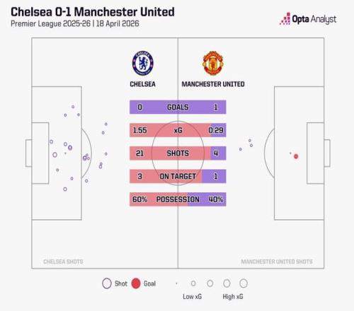 此役主場(chǎng)對(duì)陣曼聯(lián),切爾西完成21次射門,其中只有3次射正,而曼聯(lián)完成4次射門,1次射正,打入全場(chǎng)唯一進(jìn)球。