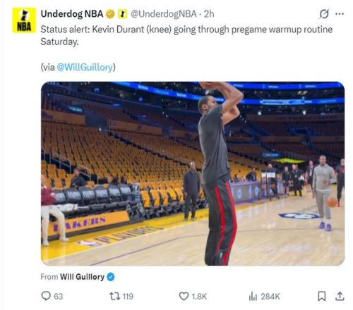 杜蘭特因?yàn)橛蚁ナ軅麩o法出戰(zhàn)G1,杜蘭特常規(guī)賽鏖戰(zhàn)78場(chǎng)沒想到在隊(duì)內(nèi)訓(xùn)練中受傷。烏度卡透露杜蘭特是髕骨上方跟隊(duì)友相撞后遭遇戳傷,除了有疼痛感外還影響了他的移動(dòng),但X光與MRI沒有結(jié)構(gòu)性傷。
