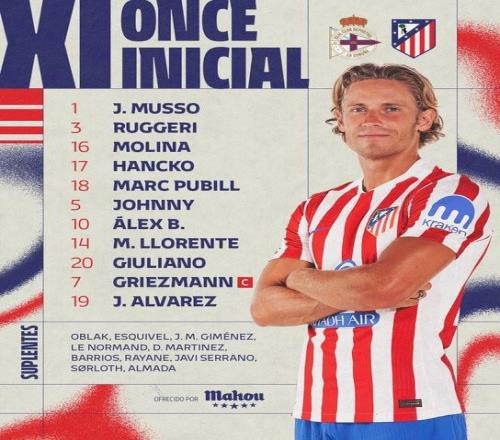 馬競首發(fā):1-穆索、3-魯杰里、16-莫利納、17-漢茨科、18-普維爾、5-卡多佐、10-巴埃納、14- 馬科斯-略倫特、20-朱利亞諾-西蒙尼、7-格列茲曼、19-阿爾瓦雷斯