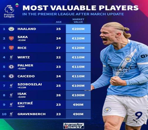 北京時間3月9日,在更新了英超球員的身價之后,德轉還統(tǒng)計出了此次更新后英超身價最高的10名球員,哈蘭德繼續(xù)以2億歐元高舉第一,身價下跌1000萬歐元的薩卡以1.2億歐元與隊友賴斯并列第二。