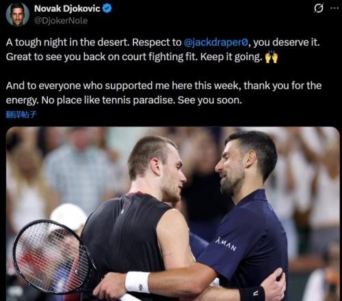 體育播報(bào)3月12日宣 德約科維奇在ATP1000印第安維爾斯大師賽輸給德雷珀,他在賽后更新了社交媒體。