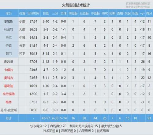 火箭打成這樣,肯定不是杜蘭特自己的問題?;鸺装l(fā)中鋒申京投籃8中5,三分1中0,罰球4中0,僅得10分2籃板3助攻3蓋帽,正負(fù)值-17。大中鋒只搶到2個(gè)籃板球,更扎心的是罰球4中0?;鸺?duì)罰球14中5,罰球命中率35.7%。