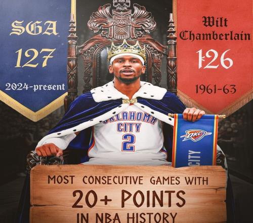 SGA出戰(zhàn)39分鐘,18投13中(三分球5中2),罰球8中7,豪取35分+6籃板+9助攻+2搶斷+3蓋帽的全面數(shù)據(jù),場上正負值為+14。這場比賽之前,SGA已經(jīng)連續(xù)126場比賽砍下20+,排在NBA歷史第2位,距離張伯倫保持的NBA歷史紀錄僅差1場。這場比賽萬眾矚目,全世界都想看看SGA到底能否打破這項塵封63年的NBA歷史紀錄。綠軍當然不想淪為背景板,可馬祖拉并沒有刻意布置防守或者采取特殊手段阻止SGA破紀錄,或者他明白SGA是不可阻擋的。SGA也就是正常打球,沒有太多花里胡哨的假把式,他在第三節(jié)用一記標志性中投完成了對張伯倫的超越,全場MVP呼聲如雷貫耳!