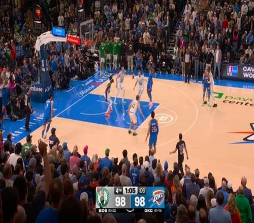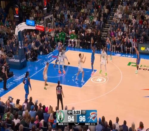 本場第三節(jié),雷霆幾乎全程落后,直至第四節(jié)剩下5分鐘前,雷霆依然以93-94落后凱爾特人1分,隨后亞歷山大接管了比賽: