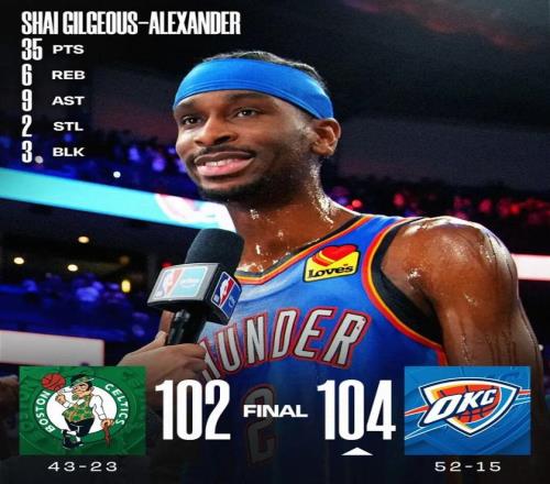——剩下1分04秒前,亞歷山大急停跳投命中,雷霆100-98凱爾特人