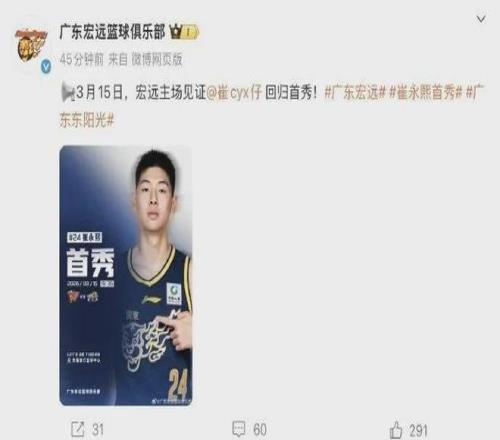 廣東隊(duì)官宣:崔永熙將在本月15日完成復(fù)出首秀。