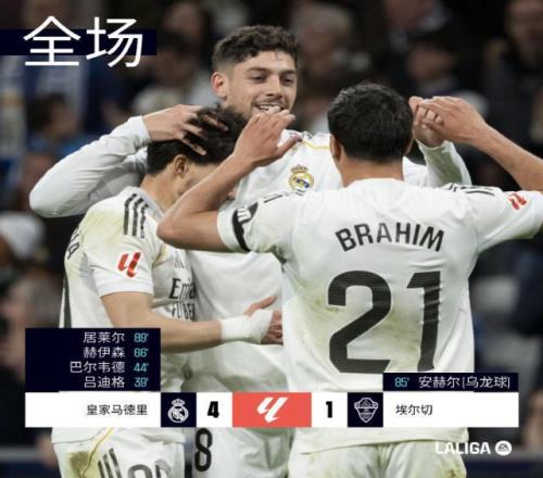 皇馬在上半場基本鎖定勝局,給自己爭取到難得的喘息空間。阿韋洛亞在第58分鐘就用掉3個換人名額,換上亞涅斯、居萊爾和貢薩洛3名小將。又在隨后幾分鐘接連換上阿瓜多、安赫爾和帕拉西奧斯3人——由于埃爾切上半場有球員頭部受傷被換下,皇馬也因此獲得第6個“腦震蕩換人名額”。這樣,算上首發(fā)的皮塔奇,皇馬本場共有5名梯隊球員登場。