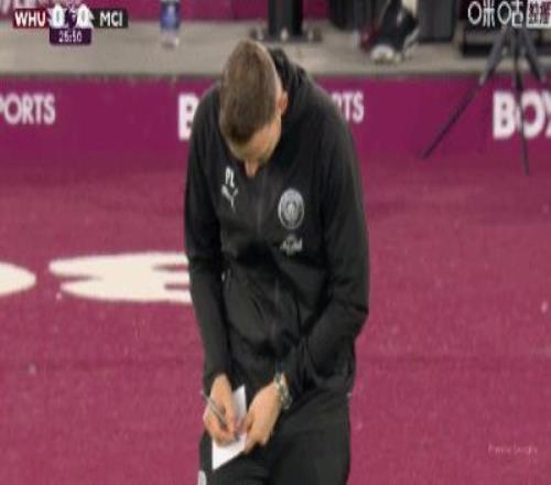 第27分鐘,表情有些糾結(jié),瓜帥助理教練林德斯場(chǎng)邊記錄