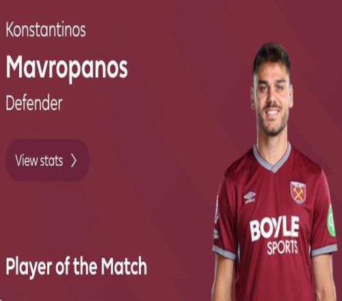 頭球破門+10次解圍,馬夫羅帕諾斯當(dāng)選西漢姆11曼城全場最佳